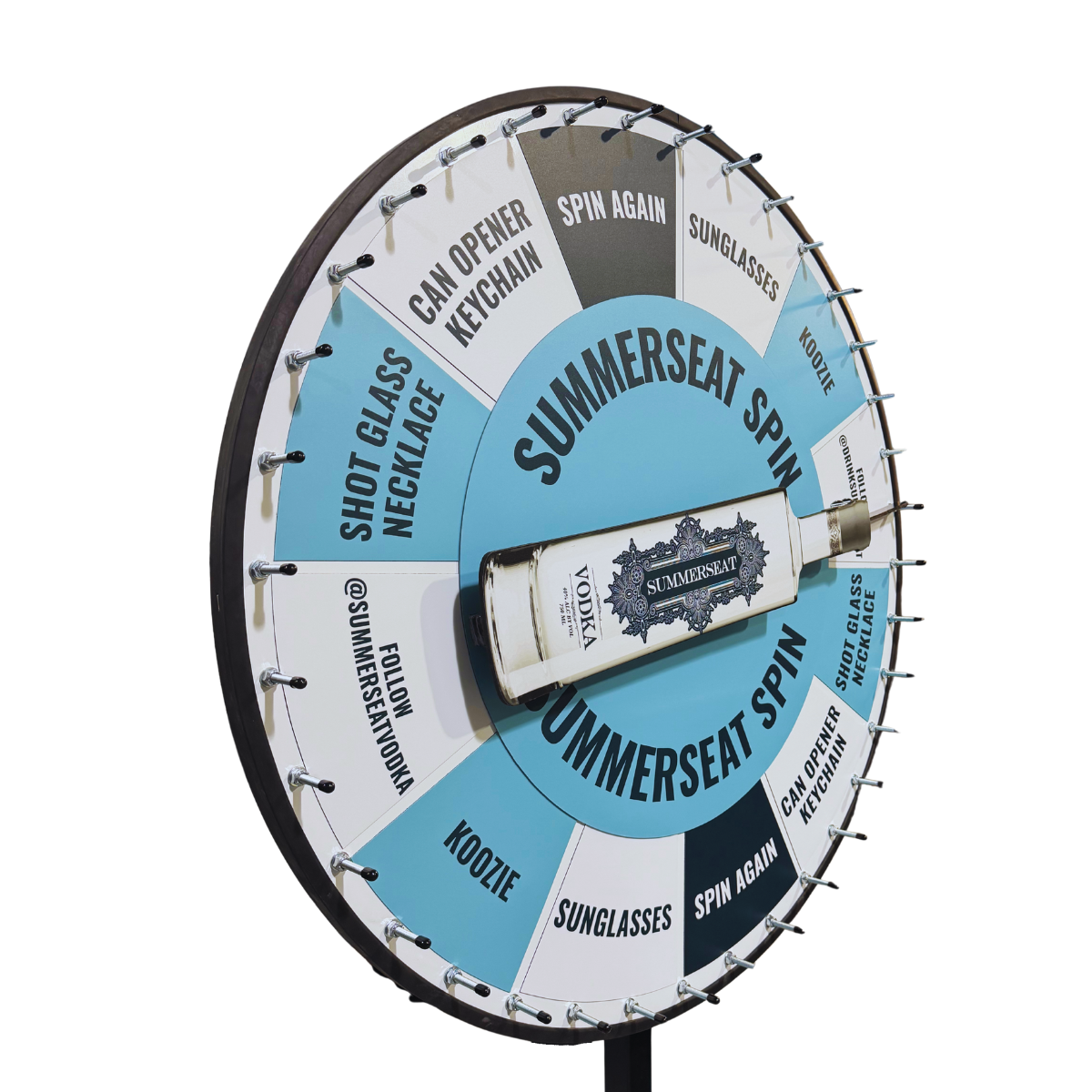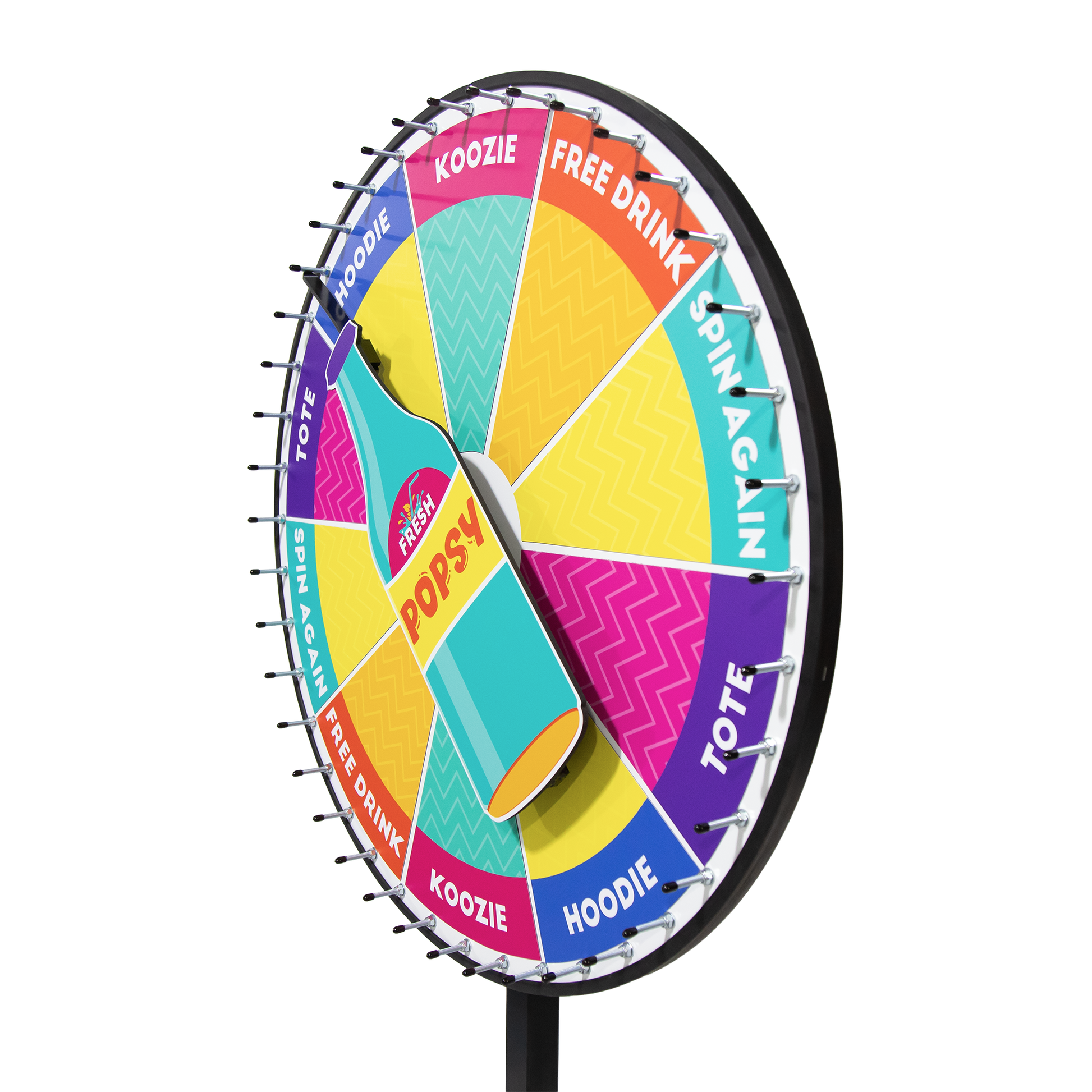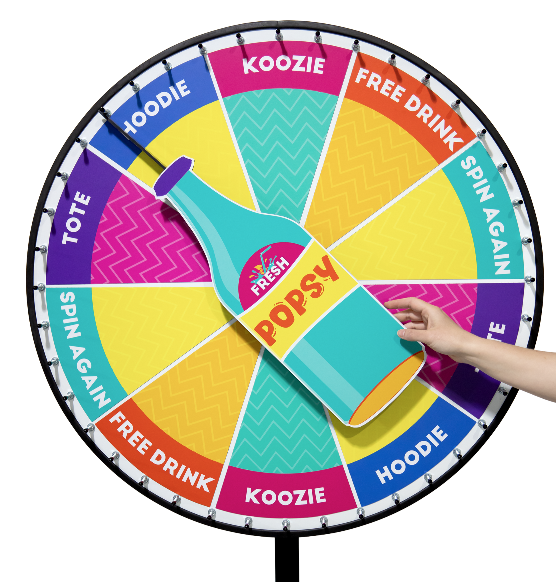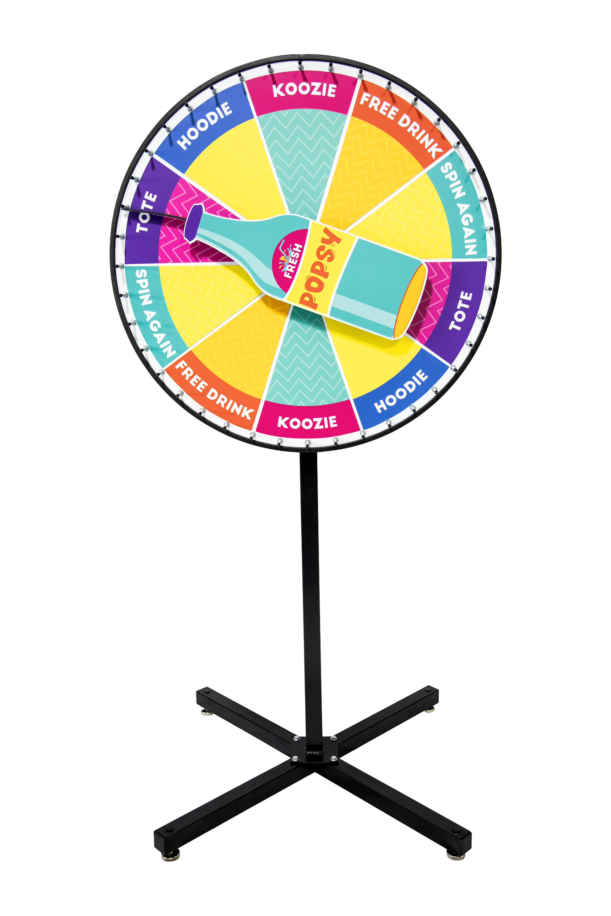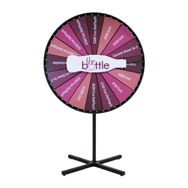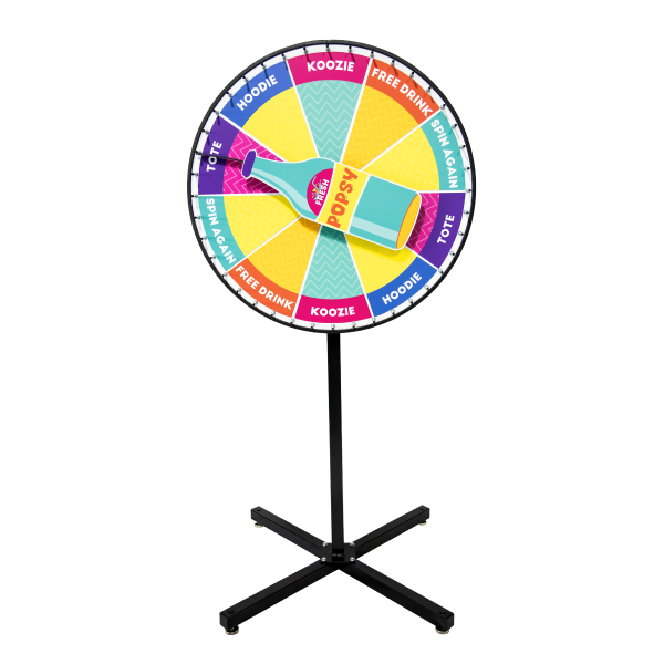 Spin the Bottle Wheel lets you swap prizes quickly for repeated use. The wheel surface contains a steel backing, and the prize sections are made with magnetic material. Order additional sections for more variety or as a backup. Our expert graphics team works with you one-on-one to create a prize wheel that perfectly reflects your brand and engages your audience.