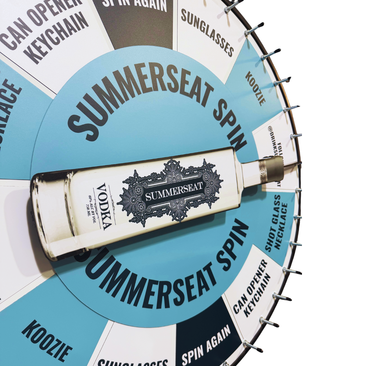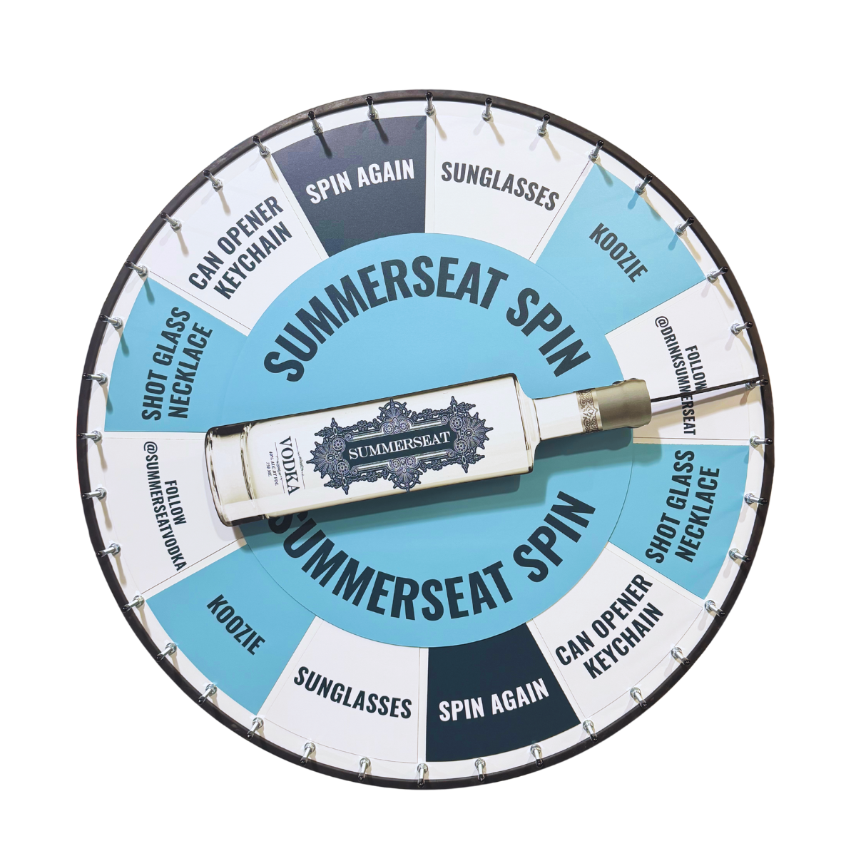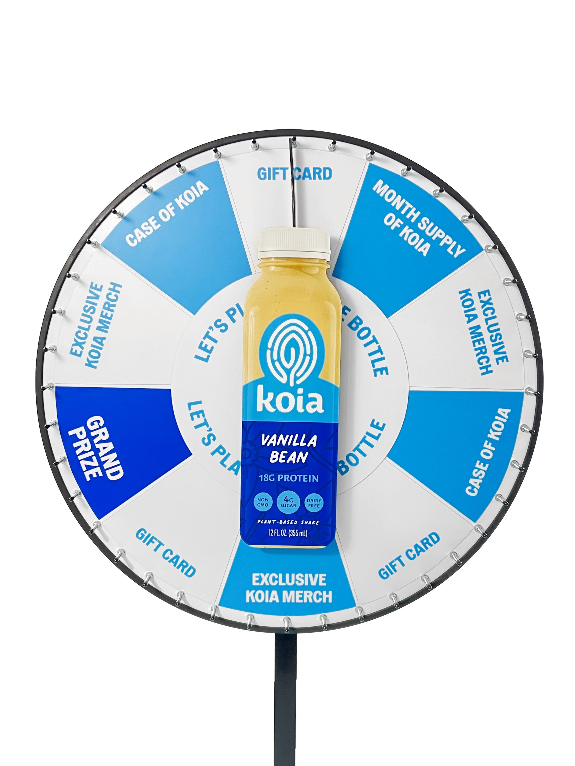 A playful twist on the classic prize wheel, this unique wheel features a smooth-spinning bottle at the center. Customize it with a guitar, airplane, arrow, or any design you imagine!
